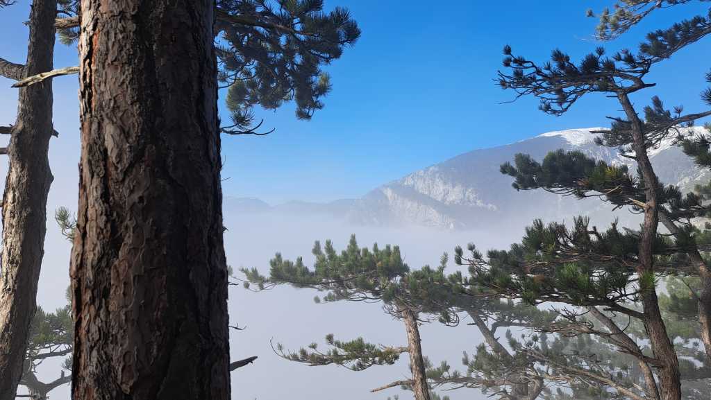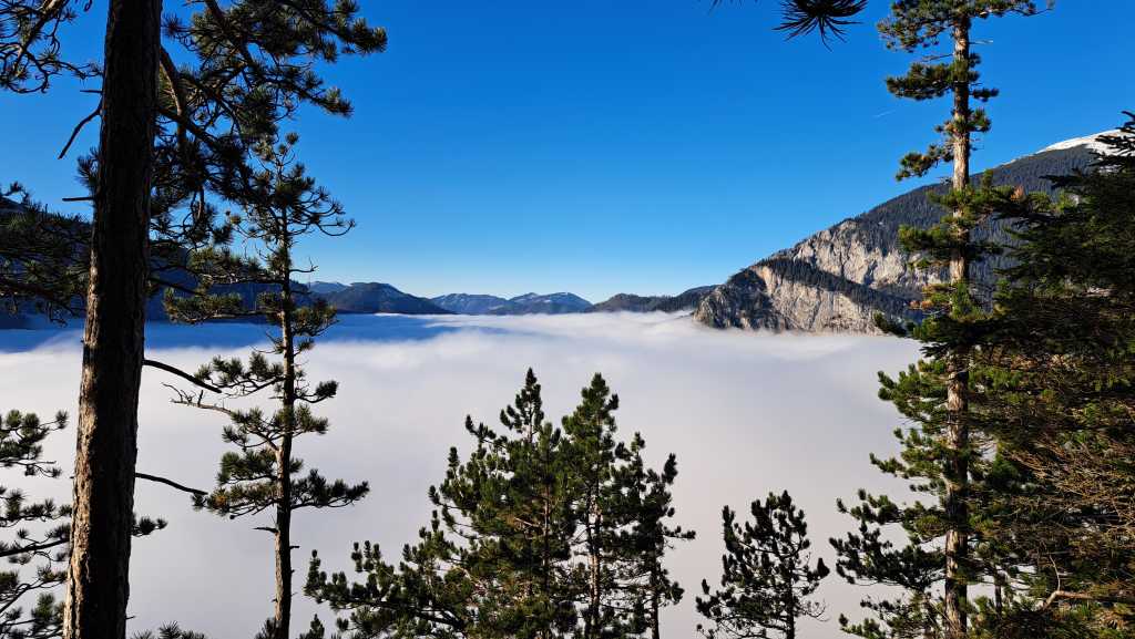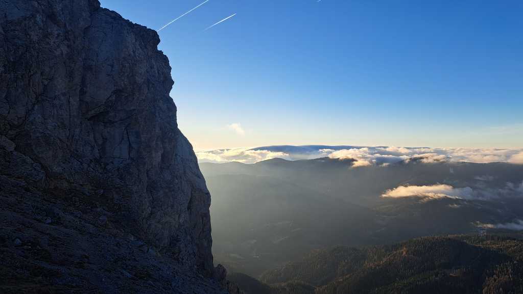 Vom Einstig des Kombinantionwegs rauf und das was halt gut ging weiter - die kleine Schlucht querend und die Kletterstelle, die mit 4- bewertet ist auf bergsteigen.at ging auch free gut, beim Tourenbuch vorbei, in der 7. SL der Himmelsleiter vorbei nach rechts und irgendwie rauf - und schon war ich beim Ausstieg der Routen angekommen - 12:14 beim Einstieg weg und um 13:22 oben - belohnt wurde ich mit Sonne und der Wolkendecke von knapp oberhalb - runter den Abstiegsweg ohne Schotterei.