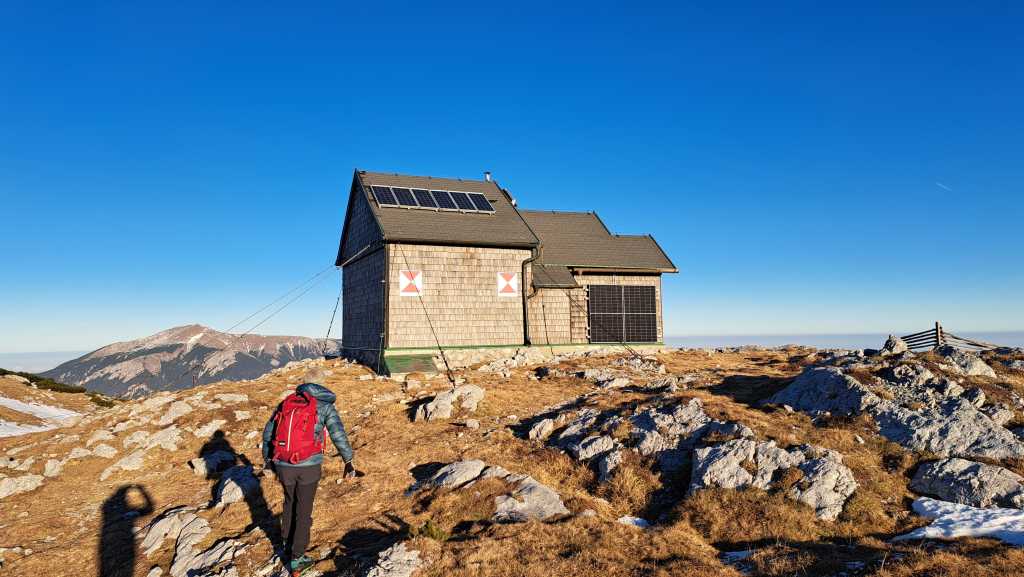 Weiter den Heminensteig und knapp vor dem Ausstieg auf die Hochfläche links zum Berghaus Hochschneeberg auf ca. 1800m.