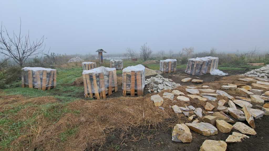 Steine zwischen 20 und 40kg sind nicht soooo einfach zu legen, wenns auch noch aufeinander und nebeneinander passen sollen - die zweite Reihe ist drauf und zuletzt wurde Ordnung gemacht, weil da natürlich auch viel herumgeschlichtet und sortiert und hin und her getragen wird, irgendwann ist alles voll mit Steinen, die nicht passen - es gibt aber eh noch 6 Paletten✌️