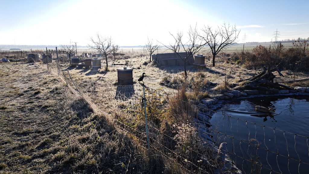 Die Kühe bleiben bei so einem Wetter bis -3 Grad in der Nacht draußen, nur wenn es regnet oder eben feucht wird, kommen sie selbstständig in den Stall!